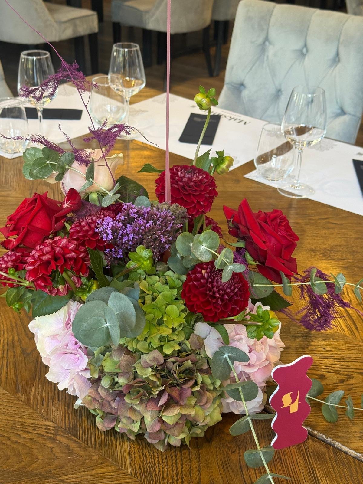 Dekoracija stola s cvjetnim aranžmanima i helij balonima
