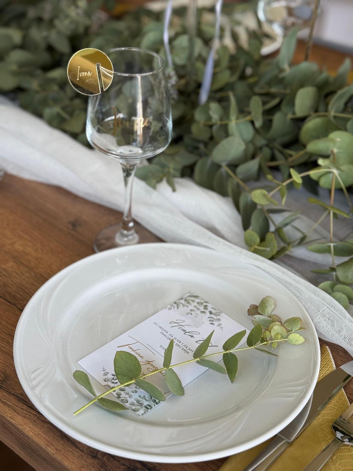 Dekoracija stola za djevojačku – eukaliptus girlanda i visoke svijeće