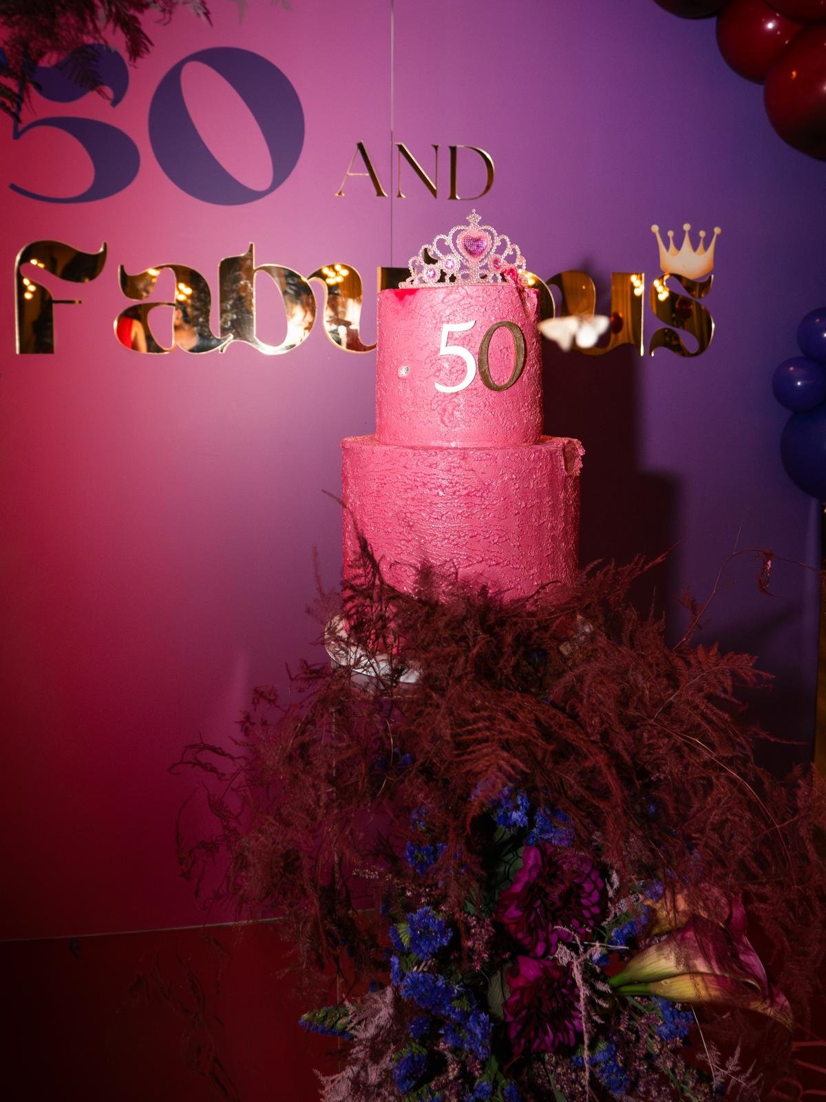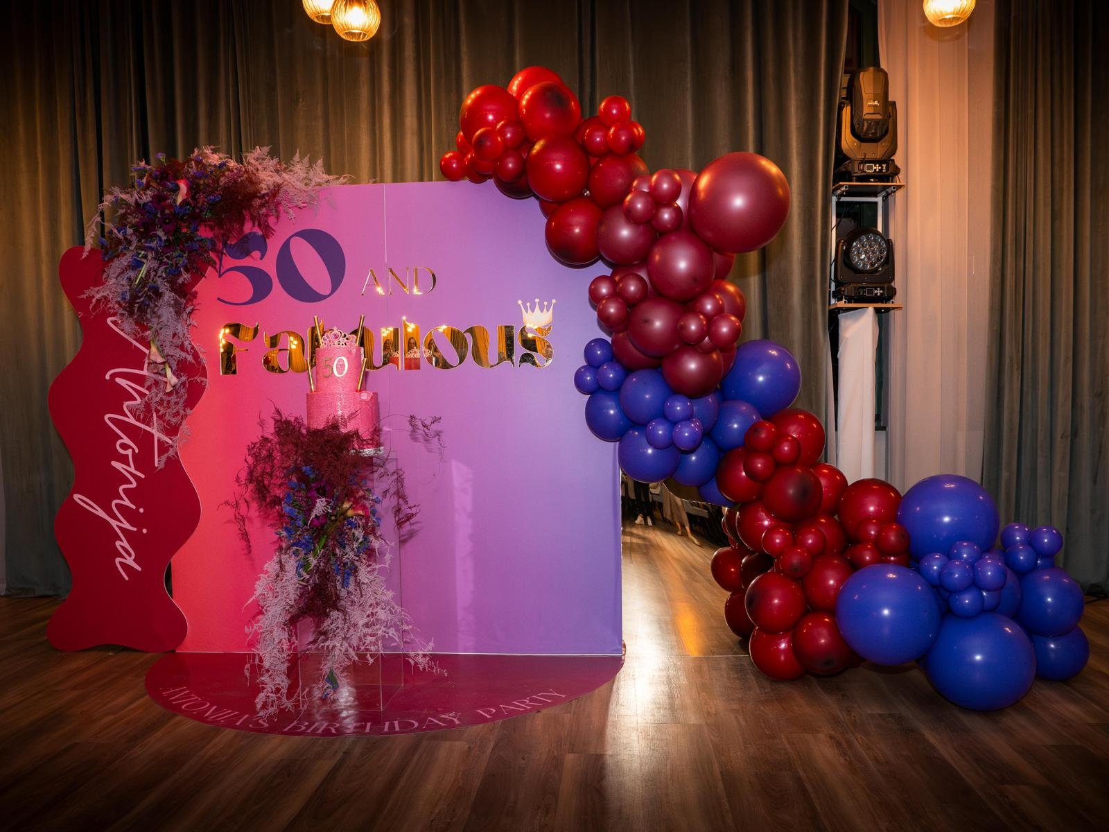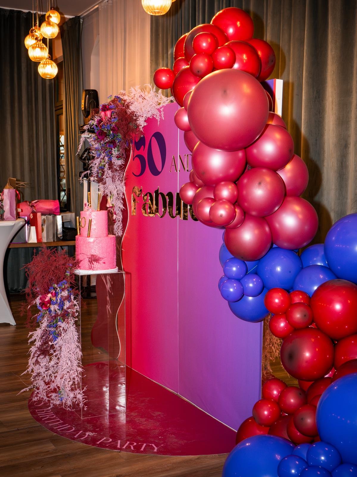 Za proslavu ’50 & Fabulous’ kreirali smo bogatu i upečatljivu dekoraciju dužine 4,5 metra u snažnim pink i ljubičastim tonovima sa zlatnim detaljima. Kombinacija intenzivnih boja i zlatnih akcenata prostoru je dala glamurozan, moćan i svečan karakter – savršen za slavlje velikog jubileja.