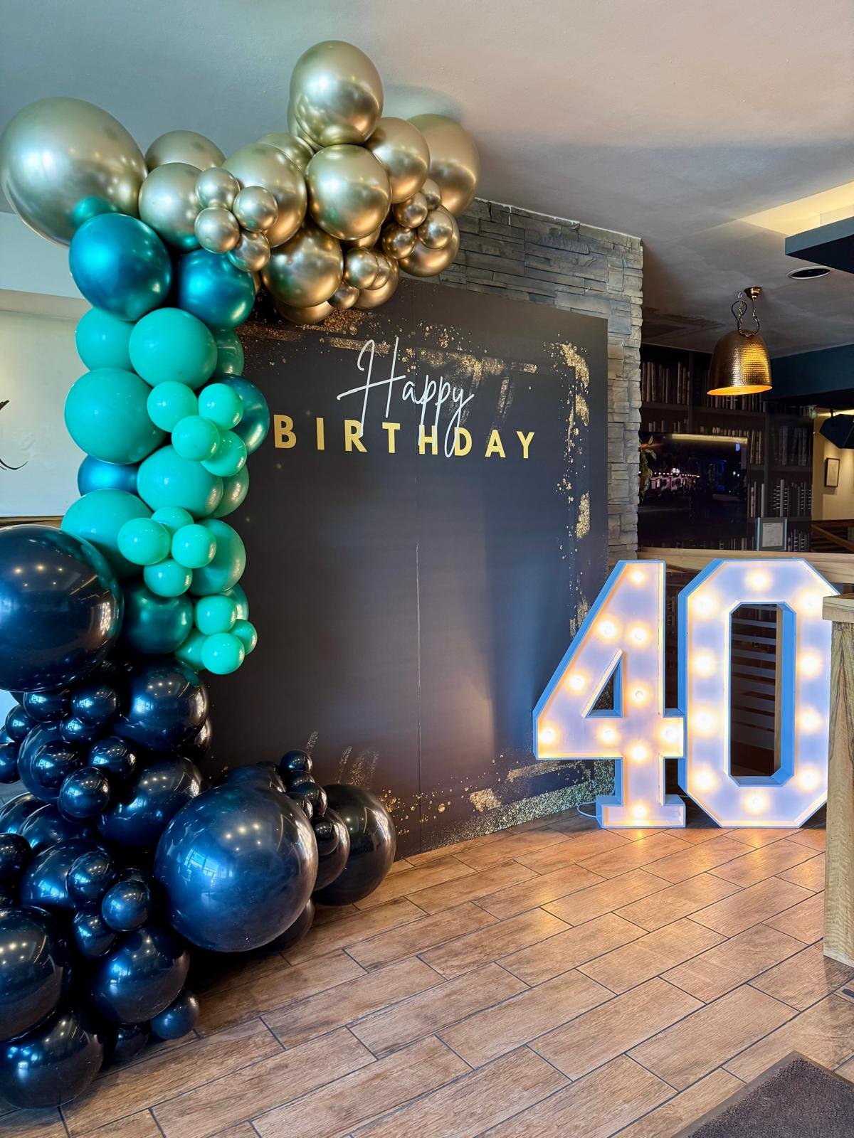 Black & Gold Prestige – 40 Velika dekoracija za 40. rođendan s duplim panelom i personaliziranim natpisom, uz crno-zeleno-zlatne balone i svjetleći broj 40, donosi luksuzan i snažan vizualni dojam. Date: February 21, 2026 Category: Muškarci Share: