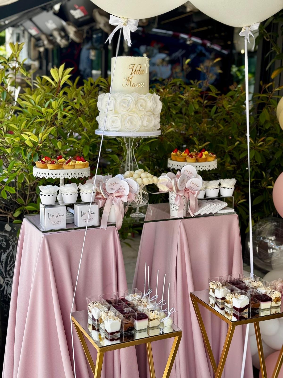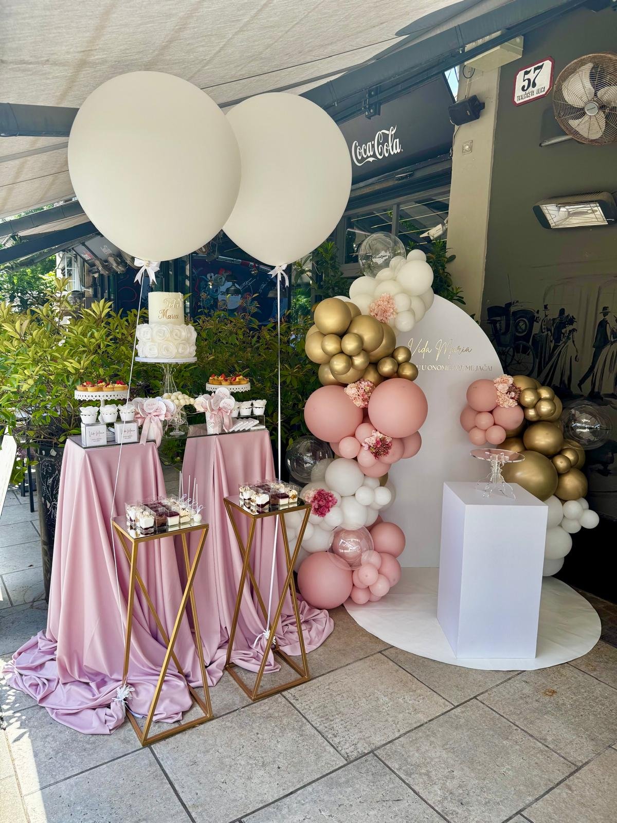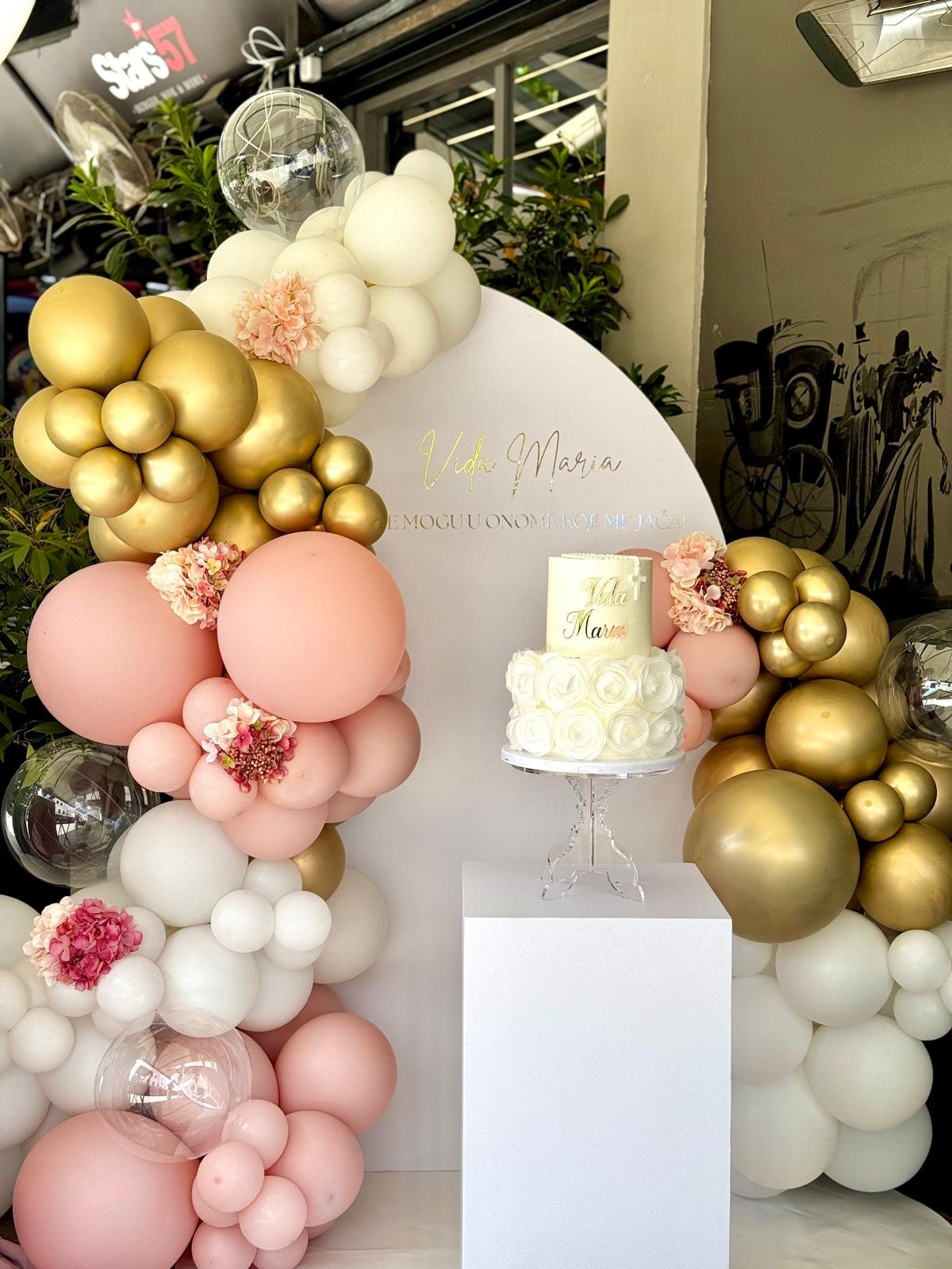 Blush & Gold Celebration Dekoracija za Prvu pričest u bijelo-zlatnim i baby roza tonovima sa slatkim stolom i slasticama by Kraljevski kolači. Dva velika helij balona dodatno naglašavaju prostor i svečanost događaja. Date: February 21, 2026 Category: Sveta Pričest i Krizma Share: