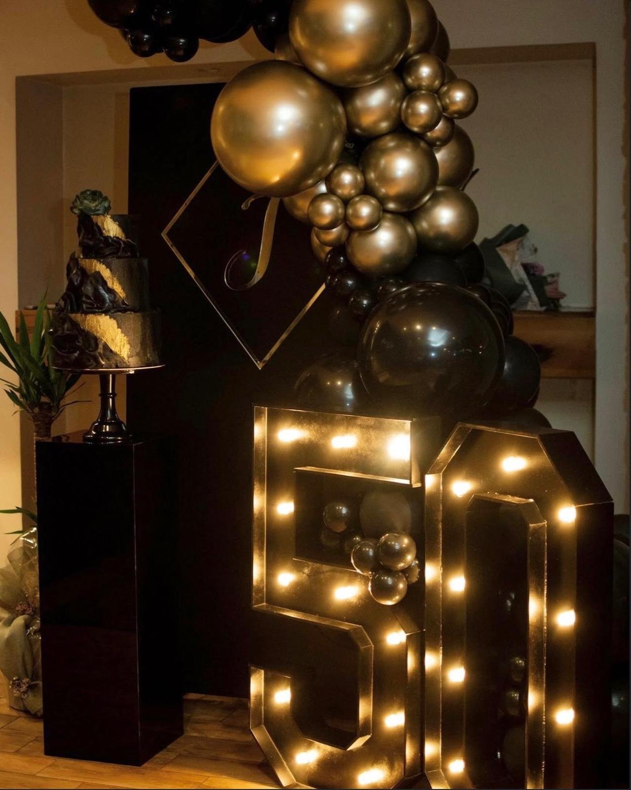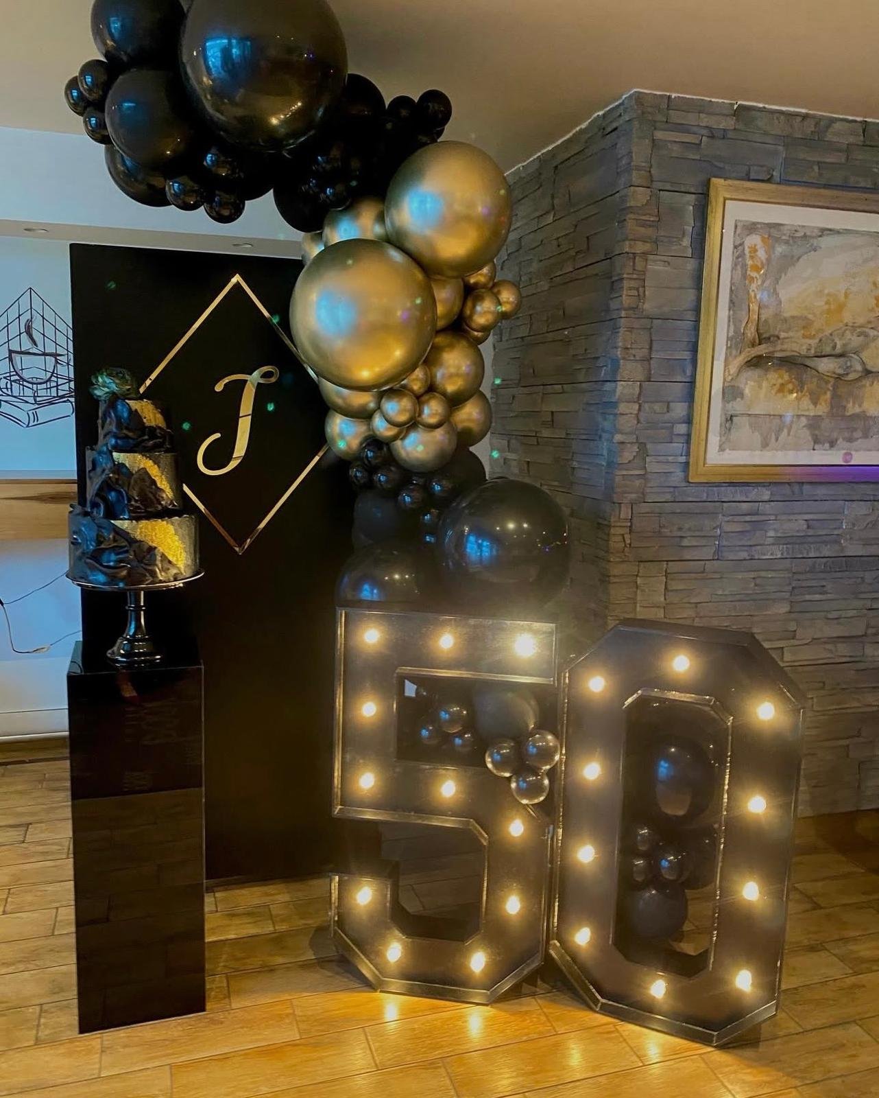 Za proslavu 50. rođendana kreirali smo sofisticiranu crno-zlatnu dekoraciju koja odiše luksuzom i elegancijom. Kombinacija duboke crne i sjajnih zlatnih detalja prostoru je dala svečanu i glamuroznu atmosferu, savršenu za obilježavanje velikog jubileja.