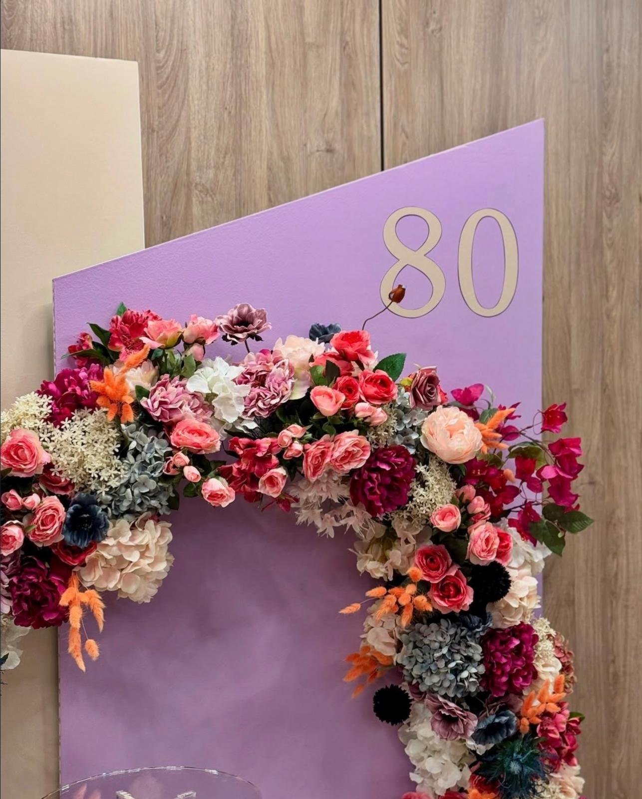 Za proslavu 80. rođendana kreirali smo elegantnu i profinjenu dekoraciju u nježnim pastelnim tonovima. Prostor je ispunjen šarenim cvijećem koje slavljenica posebno voli, čime je dekoracija dobila osobnu i emotivnu notu.