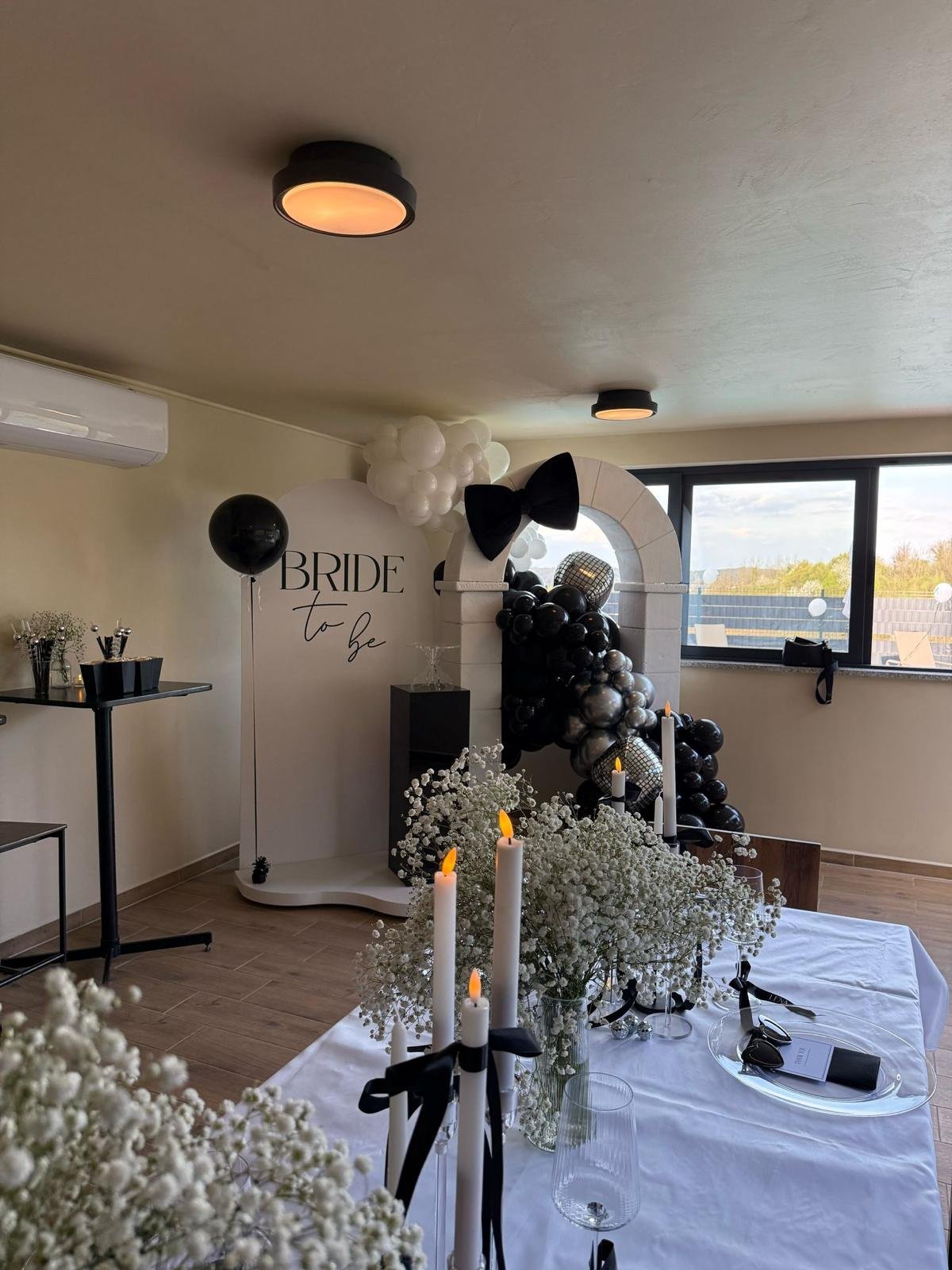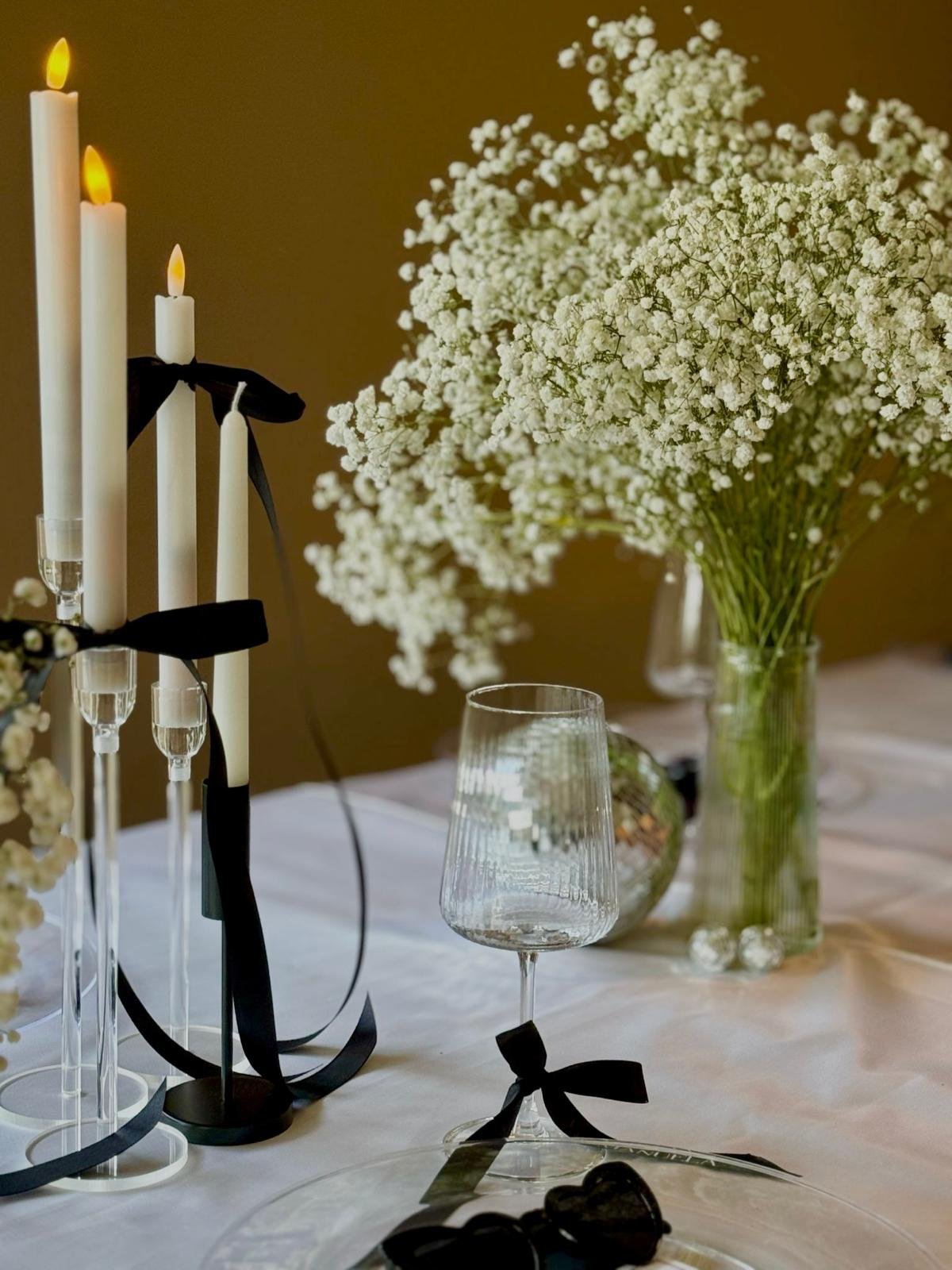 Dekoracija stola za djevojačku večer u crno-bijeloj kombinaciji odiše elegancijom i modernim stilom. Nježna gipsofilija u kombinaciji s visokim svijećama stvara profinjenu i glamuroznu atmosferu, savršenu za proslavu buduće mladenke. Ova dekoracija za djevojačku spaja minimalizam, romantiku i luksuzne detalje za nezaboravnu večer.