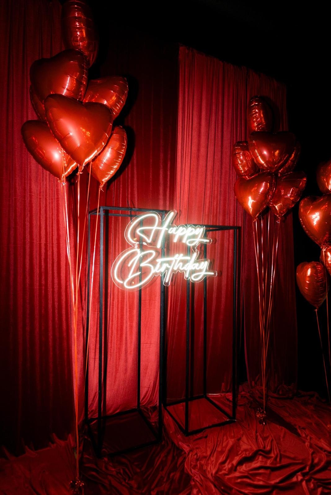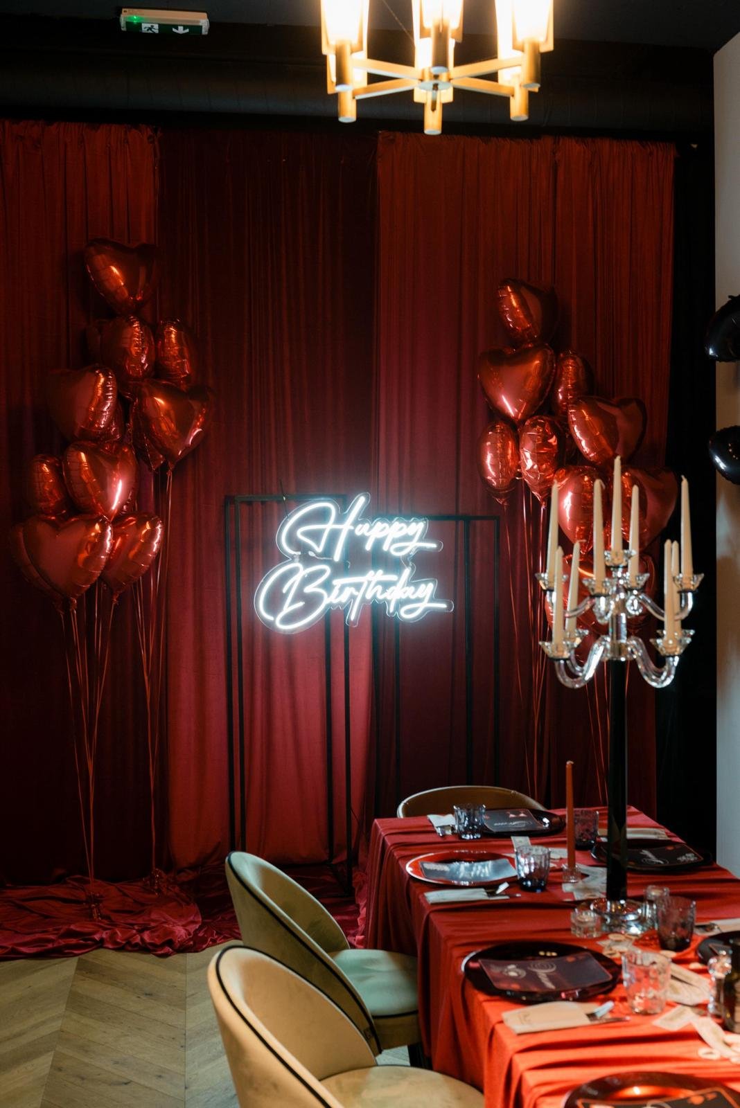 Ova glam rođendanska dekoracija u zavodljivoj crvenoj boji kreirana je za privatni party održan u restoranu Mimes Tratoria. Elegantna crvena tkanina, raskošni crveni helij baloni i upečatljivi neon Happy Birthday natpis stvorili su luksuznu, ženstvenu atmosferu s dozom odvažnosti.