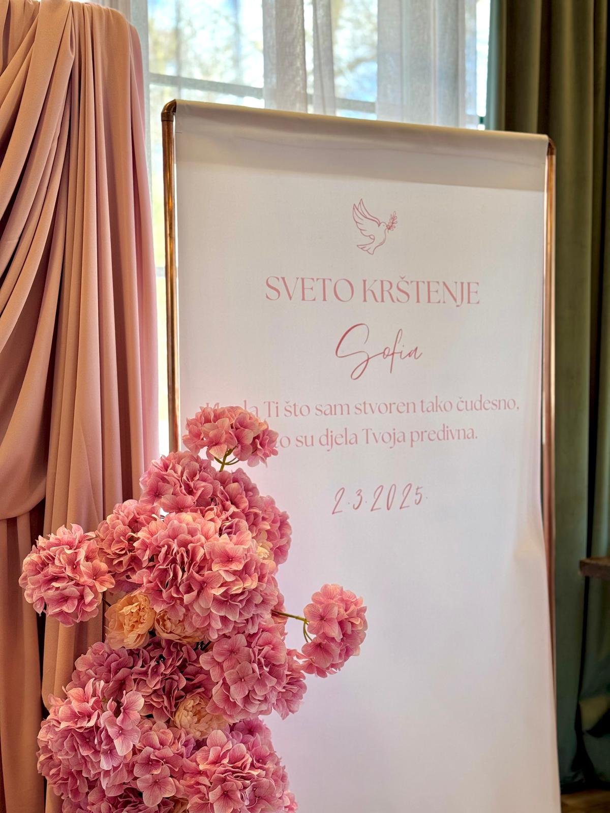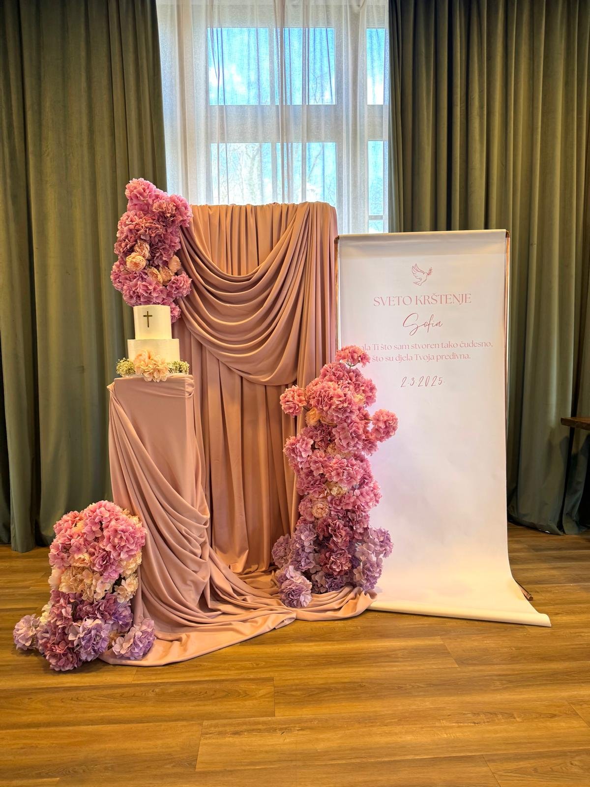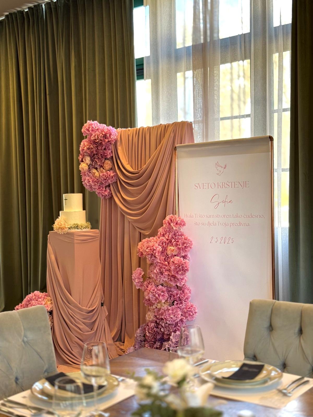 Rosé Romance Elegantna dekoracija za krštenje u nježnim rozim tonovima izrađena je s dekorativnom tkaninom i cvjetnim aranžmanima, bez balona. Romantičan i profinjen ambijent savršen je za intimnu i svečanu proslavu. Date: February 21, 2026 Category: Krštenje Share: