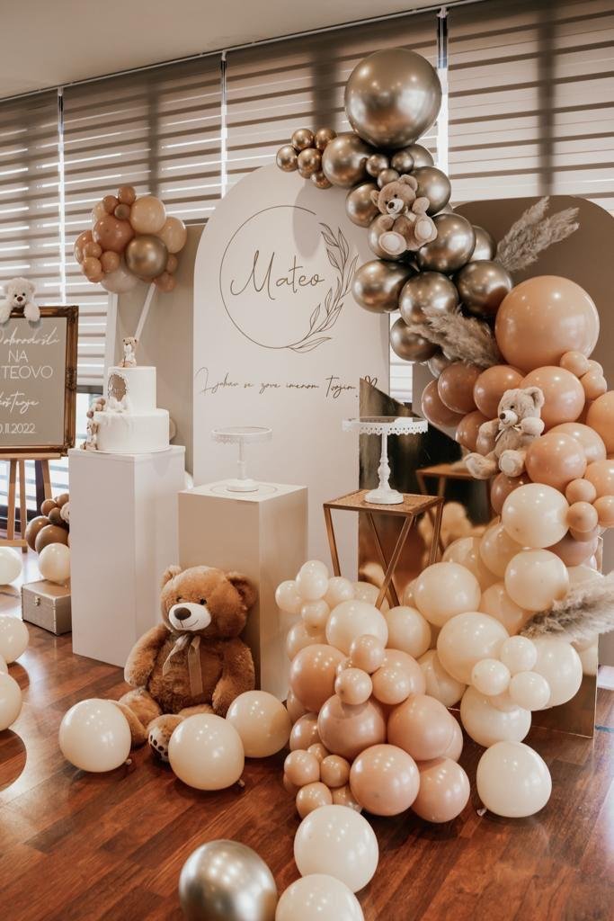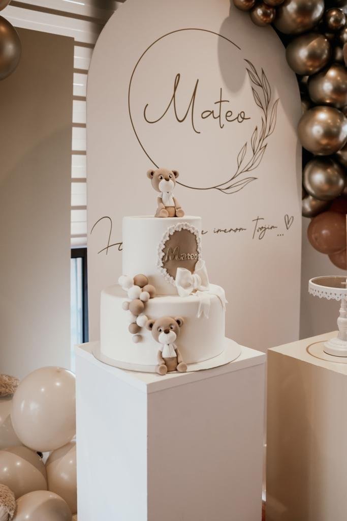 Teddy Grandeur Velika i bogata dekoracija za Mateovo krštenje s medvjedićima i balonima stvara toplu i svečanu atmosferu. Fake torta by Kraljevski kolači dodatno upotpunjuje cjelokupni vizualni dojam. Date: February 21, 2026 Category: Krštenje Share: