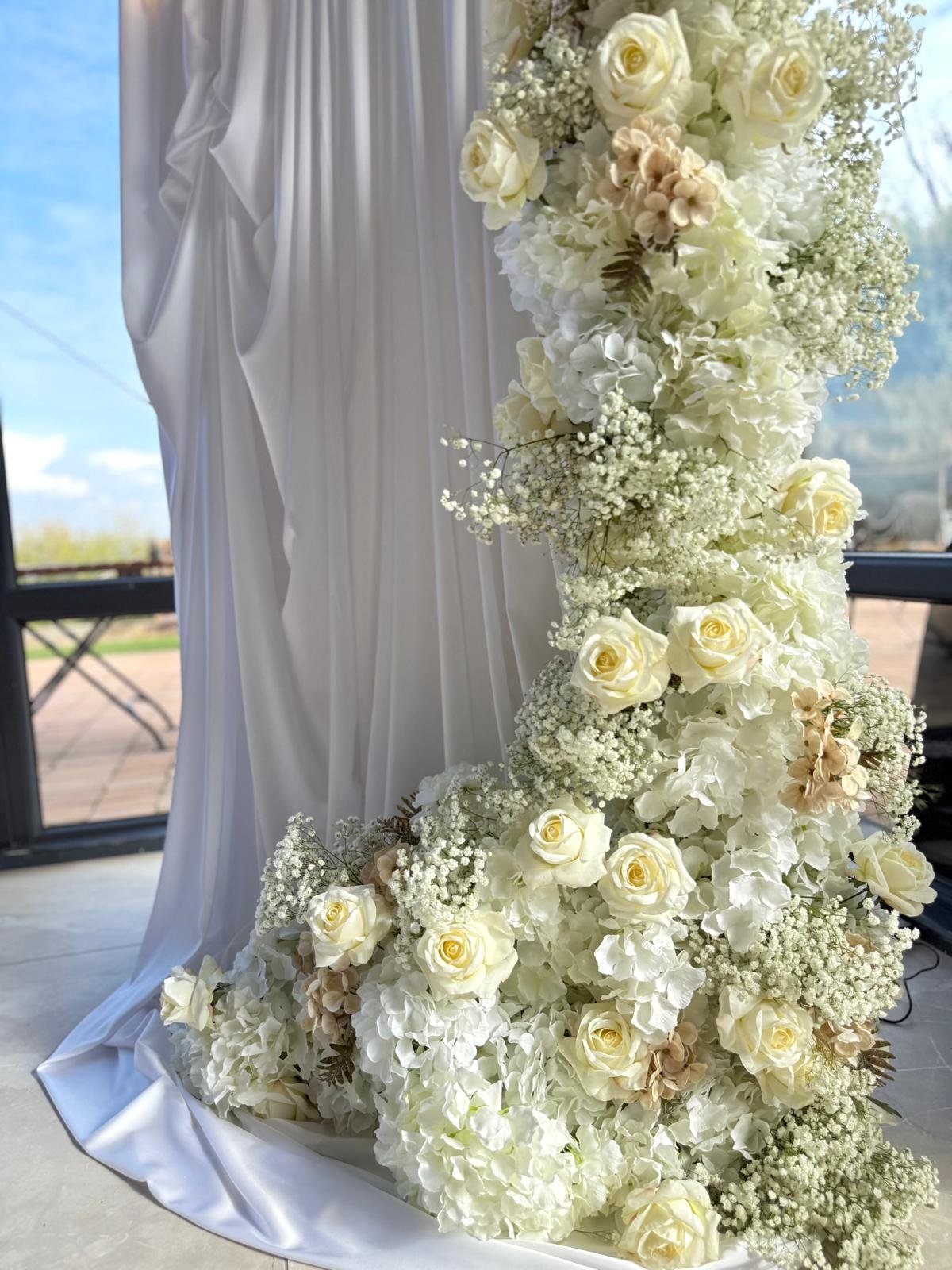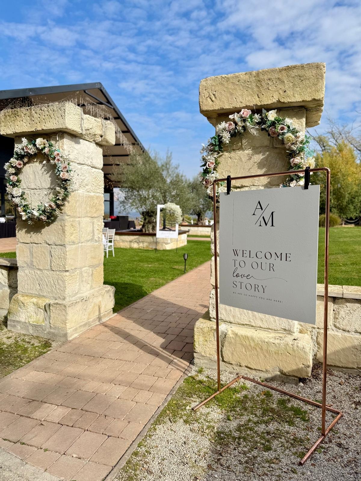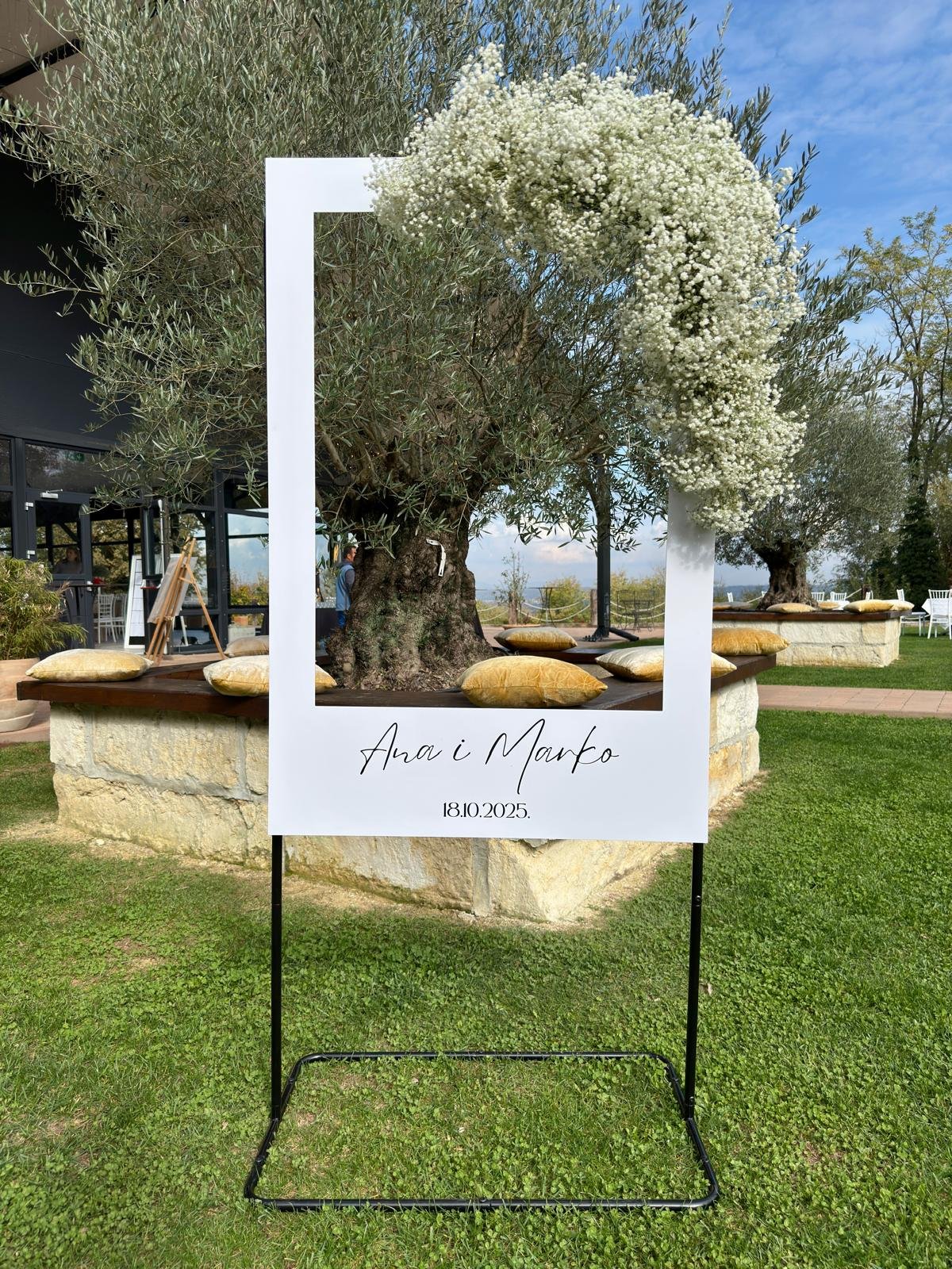 Dekoracija za vjenčanje započela je personaliziranim natpisima dobrodošlice na ulazu u imanje, stvarajući svečan prvi dojam. Foto kutak s natpisom i bogatom gipsofilijom pružio je romantičnu kulisu, dok je u glavnoj sali dominirao neon natpis ‘Vjeruj u ljubav’.